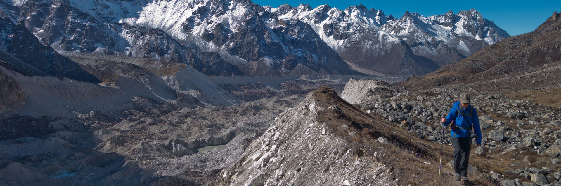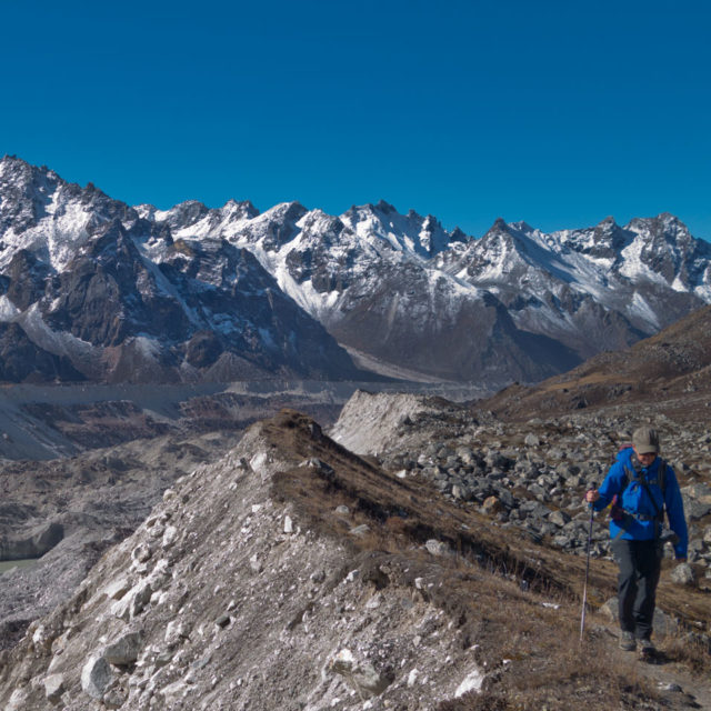 We have a big day ahead of us today, so we head out early morning, following the lateral moraine towards Pangpema. There are some fairly big ups and down crossing some recent landslides but otherwise it is a gradual climb all the way. Views of Chang Himal, Nepal Peak and Gimmigela peak are stunning. After about four hours trekking, we reach Pangpema and get the stunning Kanchenjunga views. Neither sunset nor sunrise are spectacular from Pangpema, so on this middle of the day visit you’ll catch the mountains in the best light. Combined with the altitude, this is a long and tough day, do bring plenty of snacks and water. Your guide will advise on whether the simple lodge at Pangpema is open, or not, for lunch.